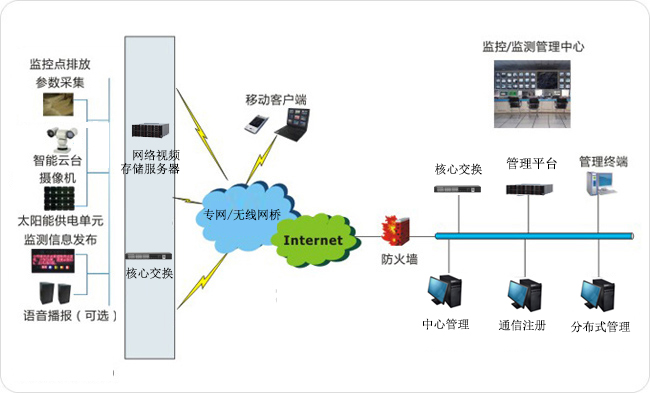 该系统通过专网或无线网桥将前端监控点视音频信号和污染参数接入综合管理平台。