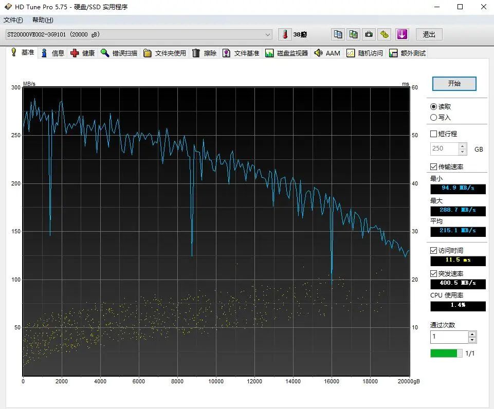 因为无法在智慧监控系统中进行实际测试,编辑将希捷酷鹰人工智能20TB硬盘接在日常使用的电脑平台上进行了速度测试。